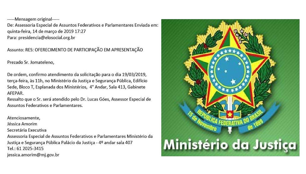 Conforme palavras do Dr. Jomateleno dos Santos Teixeira, diretor-presidente do Elo Social Brasil, acompanhado da Sra Cida Gracietti, diretora nacional do Elo Social Brasil, foram atendidos pelo Secretário Geral do Ministério da Agricultura, o Sr Fernando Silveira Camargo responsável pelo nosso segmento, acompanhado de 04 (quatro) técnicos, todos especialistas.